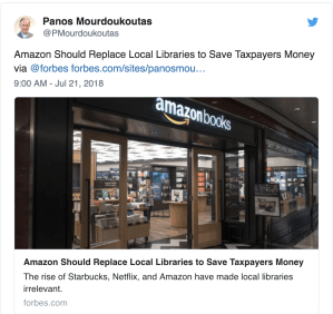 El Sr. Mourdoukoutas no tiene idea del valor y mucho menos del servicio que presta la biblioteca pública ya que su argumento estriba en que los ofrecimientos de ésta se pueden recibir con Amazon, Starbucks y Netflix. El Sr. Mourdoukoutas, por supuesto, no toma en cuenta ni le interesan los niveles de pobreza, los marginados o las personas sin hogar.